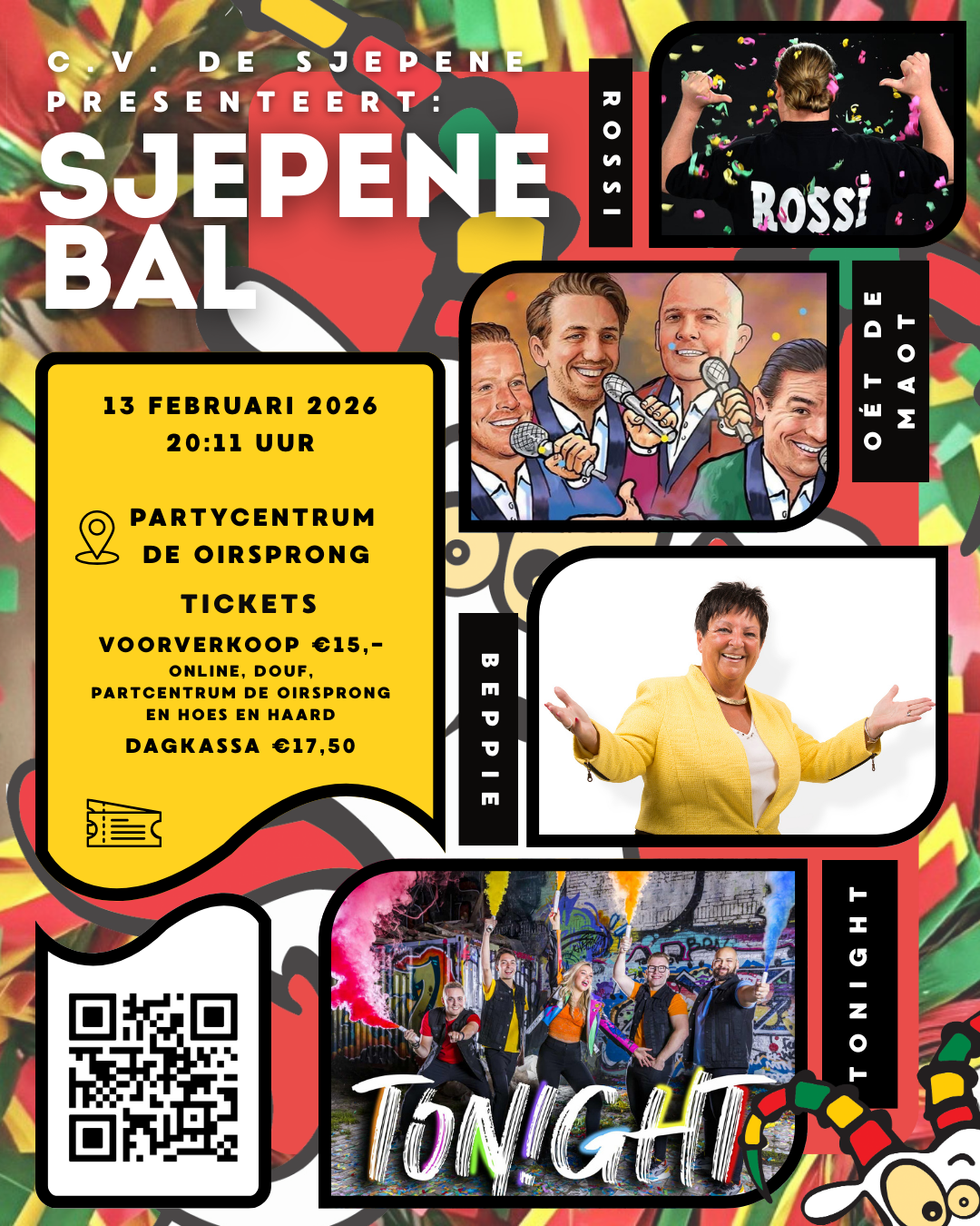 Keartjes zin te koop biej Douf, Partycentrum De Oirsprong en Hoes en Haard of online via https://shop.ikbenaanwezig.nl/tickets/event/cv-de-sjepene-sjepenebal-2026